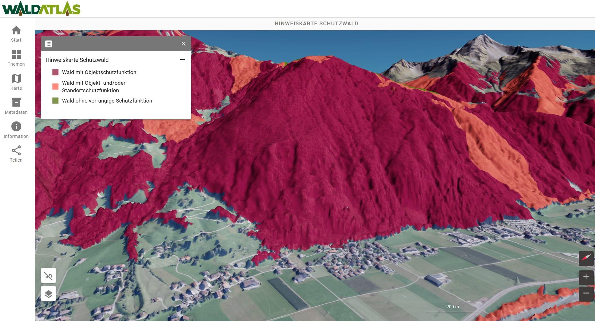 Mit der Umsetzung der innovativen 3D-Visualisierung ist jetzt ein entscheidender technologischer Forstschritt gelungen, der für alle kostenlos zur Verfügung steht. Ab sofort kann man ganz Österreich im WALDATLAS in beeindruckender 3D-Ansicht erkunden. Ob Gefahrenzonenplan der WLV, Lawineneinzugsgebiete oder Hinweiskarte Schutzwald – räumliche Zusammenhänge werden sofort sichtbar.